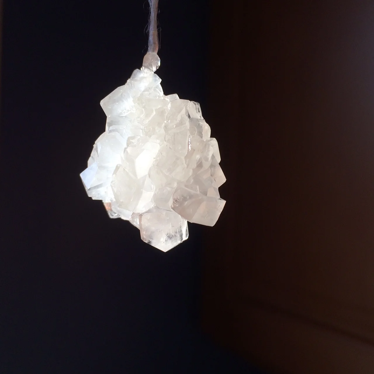 Crystals will start to form in a few hours and will weigh down the string. If crystals start to form across the surface of the water, you can break them away. Where any crystals start to form more will attach to them, crystals will start to form on the sides of the jar. You can break them away, or you can leave them. After a day or two, you can remove your crystal, let it dry, and hang where you like.