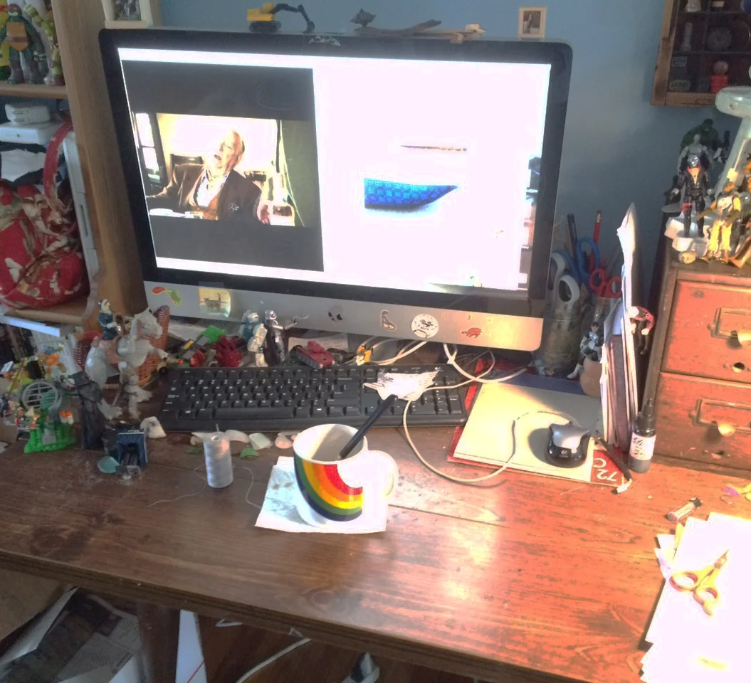 My workspace in all it's messy glory. Please note TMNT, Destro, tauntaun, sand, thread, coffee, tattoo ink, scissors, scissors, scissors, British comedy, Library Card boxes, curio cabinet, Bossk, Captain Picard, sea glass, and more....