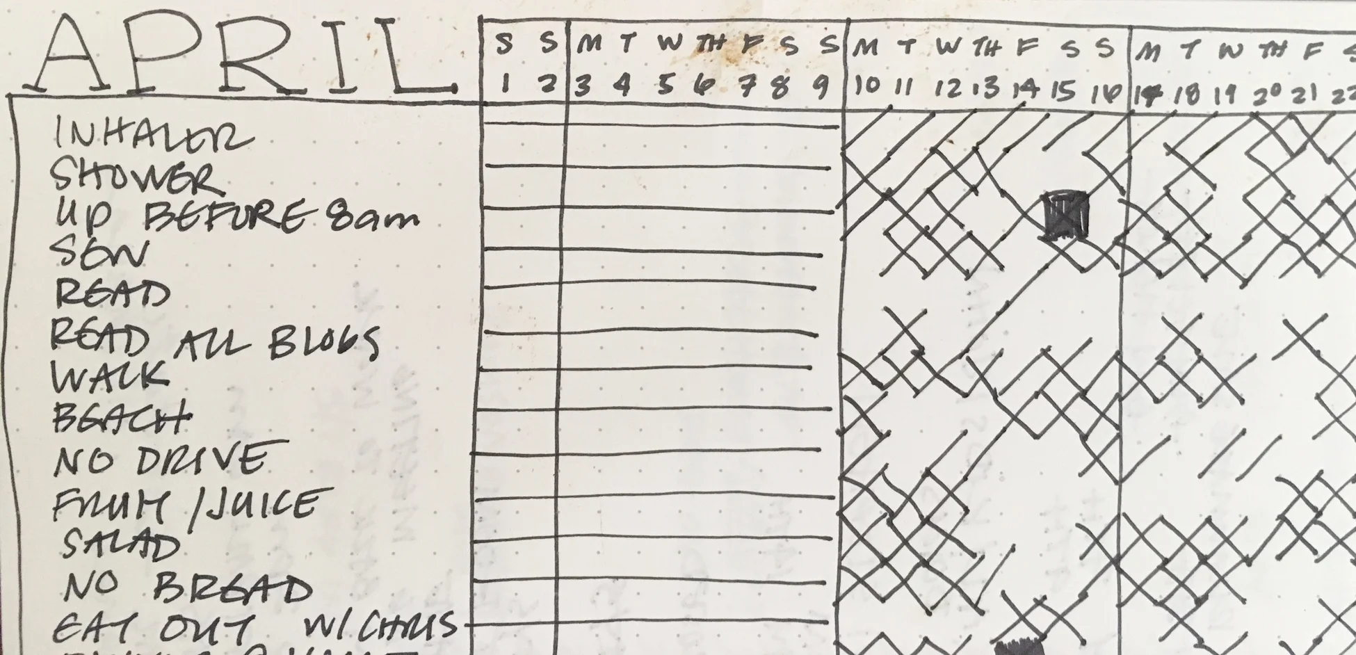 Up until now I have had sewing as just one line on my habit tracker. I track approximately 30 -34 activities on this tracker per month. Mostly they stay the same but occasionally I add a seasonal activity or a habit I'm trying to pick up. Sometimes I drop a habit that I don't feel needs tracking or that I move to a different feature of my journal. My habit tracker is just a yes/no, did it/didn't do it affair. If it's checked I did it.
