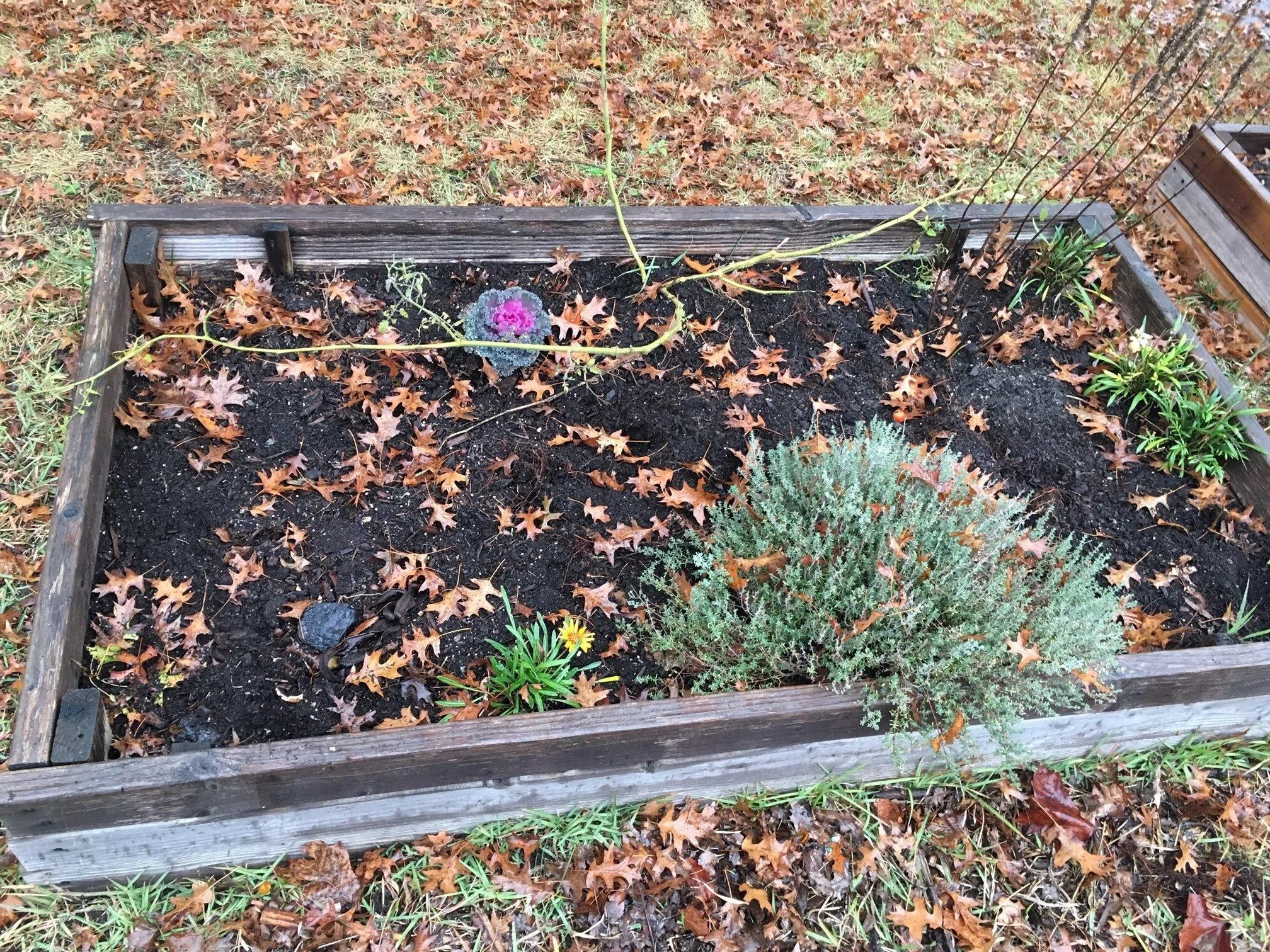 The tomatoes in the front bed all died and we were able to take the stakes down. But the orange sage is still going strong for the end of it’s second season. We transplanted all the peppers we had in pots to the new front bed that we had intended for herbs but never planted. The peppers did well in the front until the cold snap.